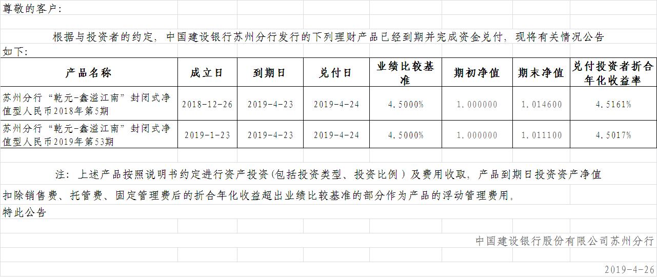 苏州分行“乾元-鑫溢江南”封闭式净值型人民币理财产品2018年第5期、2019年第53期终止公告